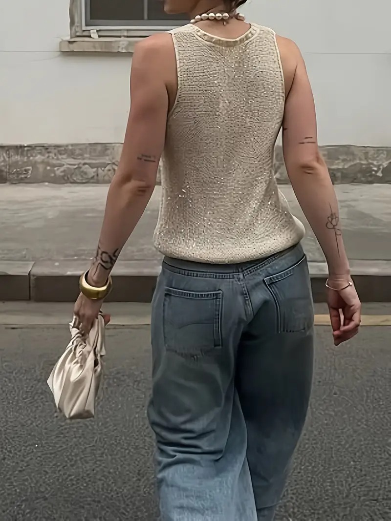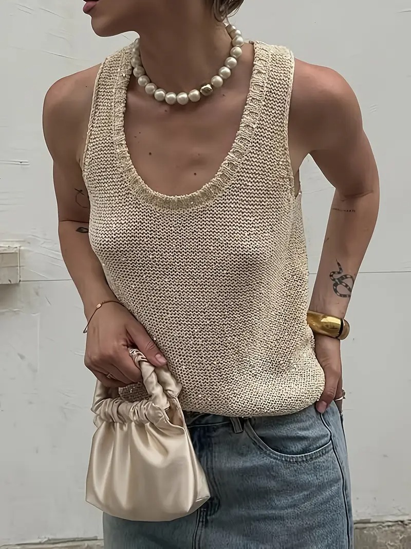 Blusa sin mangas tejida en punto grueso con textura visible, perfecta para un estilo effortless y con carácter. Su escote redondo amplio y detalles acanalados en cuello y sisas aportan un acabado relajado pero sofisticado. El tono beige neutro la convierte en una prenda versátil y fácil de combinar con mezclilla o prendas más formales.