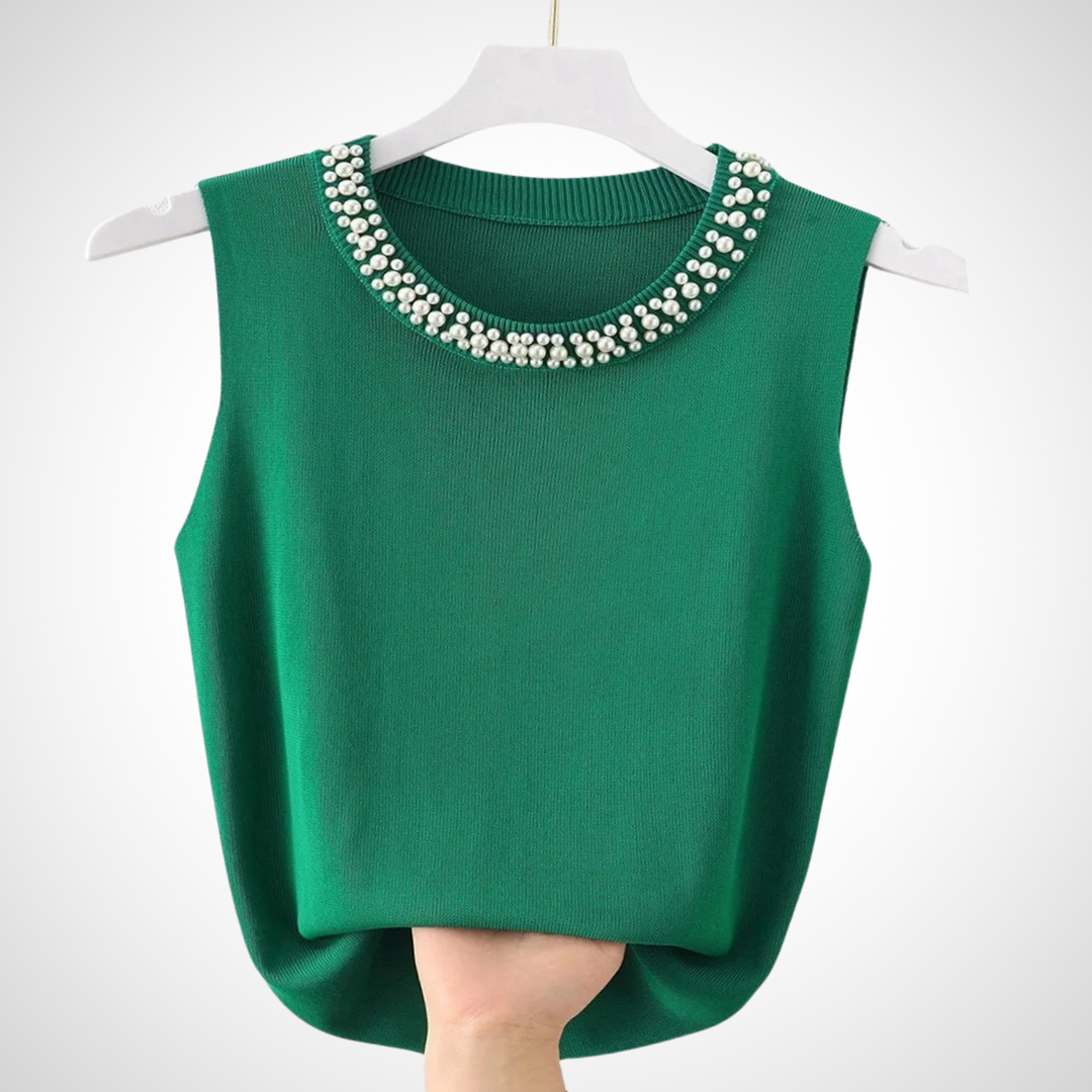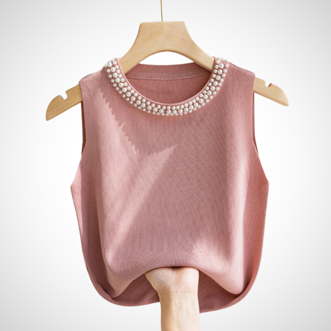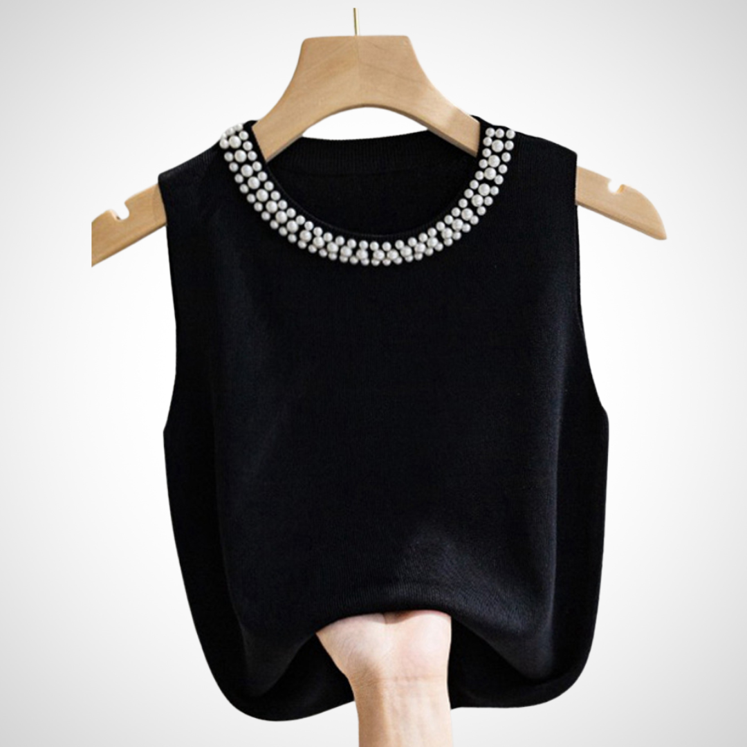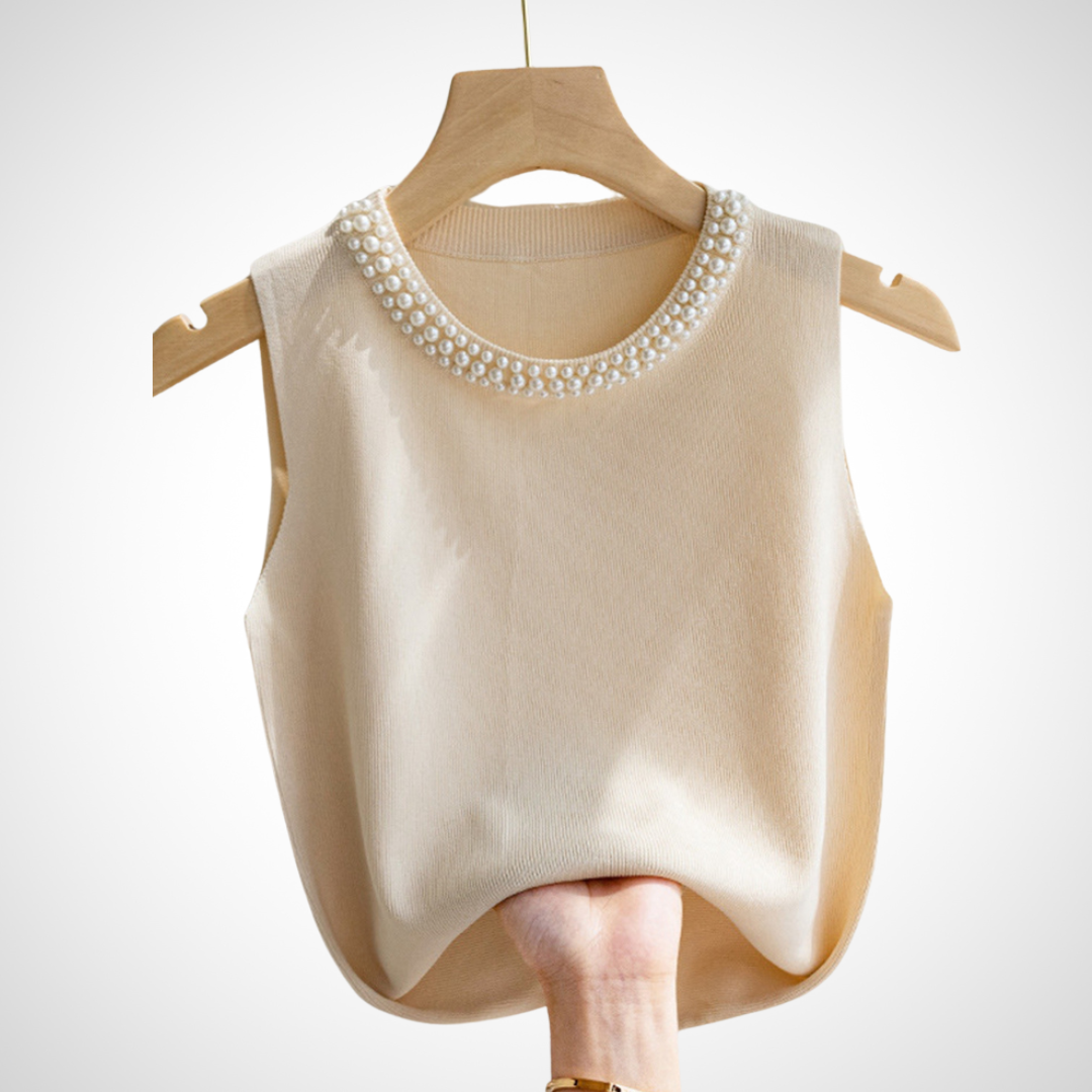 Blusa sin mangas confeccionada en tejido de punto suave y ligero. Diseño elegante con cuello redondo decorado con perlas, ideal para un look sofisticado y femenino.