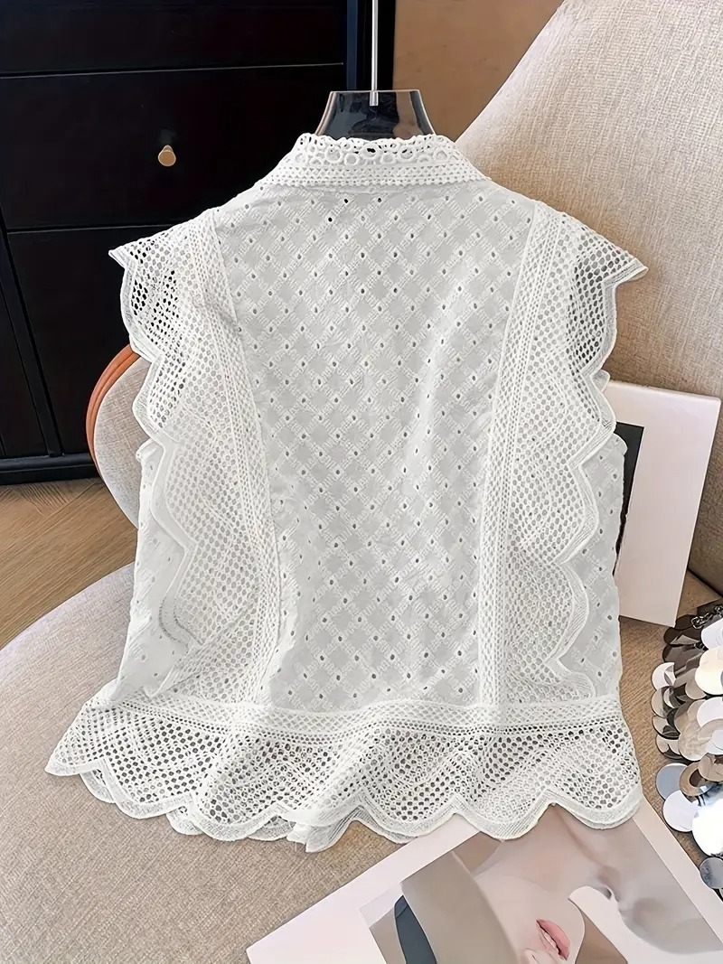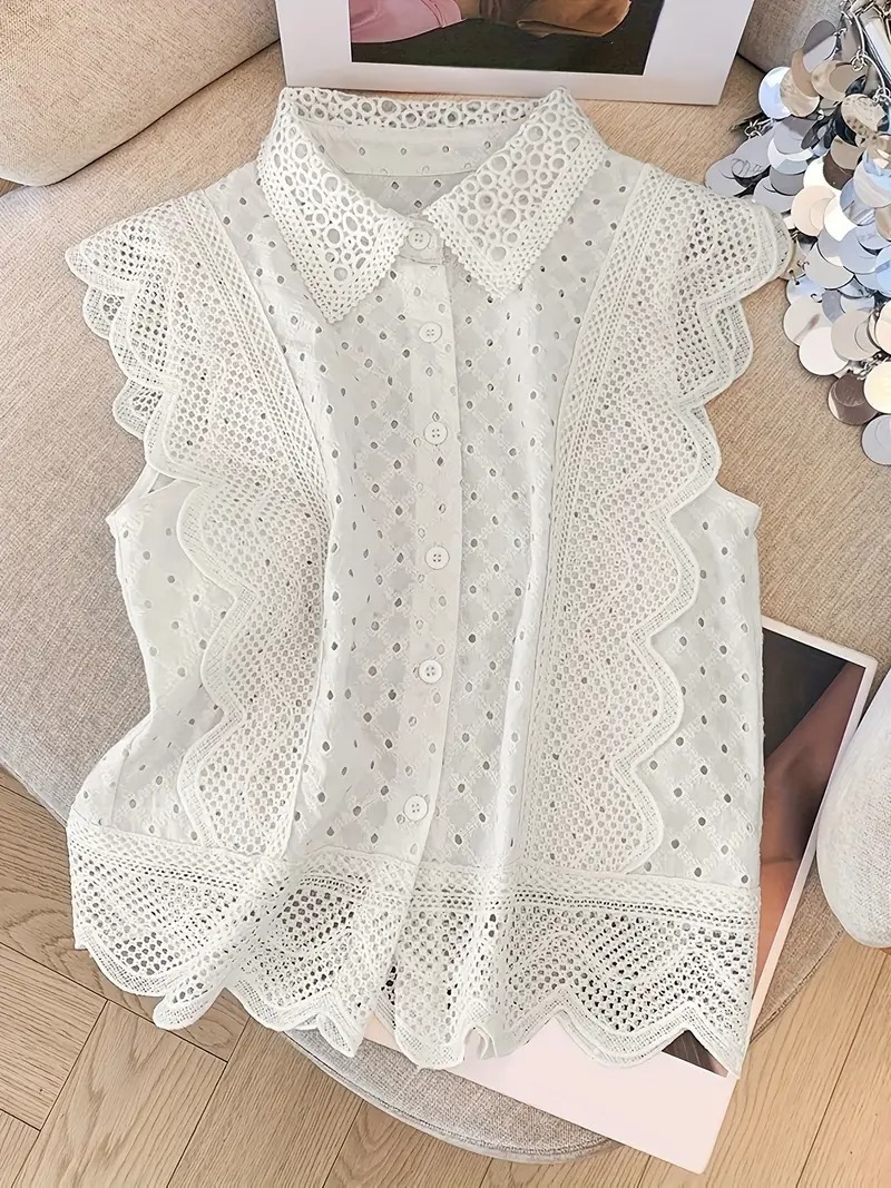 Esta blusa sin mangas en color blanco combina la elegancia del bordado inglés con detalles de encaje calado en ondas. Su cuello clásico y botones al frente la hacen una prenda delicada y atemporal, ideal para elevar cualquier look con un toque femenino y fresco. Perfecta para días soleados o eventos especiales de día.