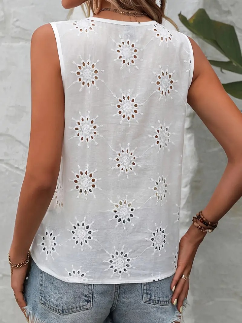 Esta blusa sin mangas con escote en V y botones decorativos está confeccionada con un bordado tipo ojal que le da un toque artesanal y femenino. Su diseño fresco y relajado la convierte en una prenda ideal para los días cálidos, sin dejar de lucir sofisticada. Disponible en blanco y negro, dos tonos básicos que combinan con todo.