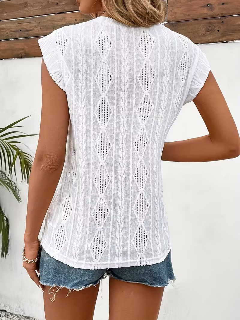 Luce fresca y natural con la blusa “Sol”, una pieza delicada de estilo bohemio chic que combina feminidad y comodidad. Confeccionada en tejido blanco calado con diseño geométrico, esta blusa sin mangas y con sutiles vuelos en los hombros es ideal para los días soleados. Su corte recto y ligero te permite combinarla fácilmente con shorts, jeans o faldas para un look relajado y encantador.