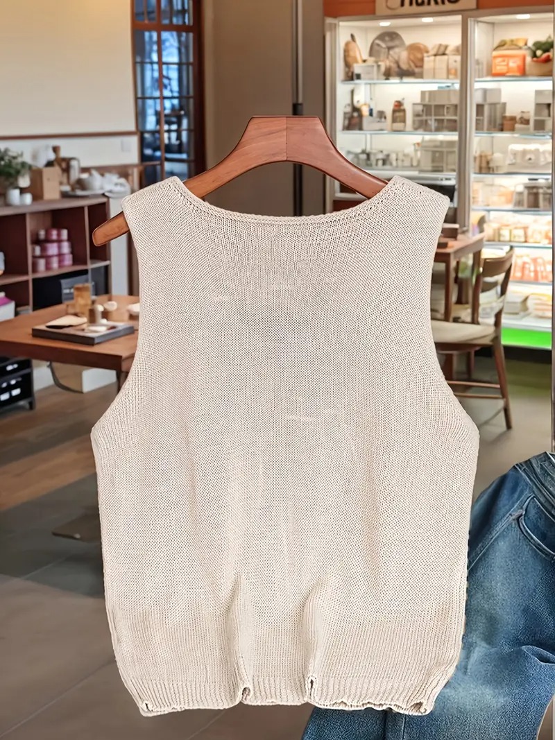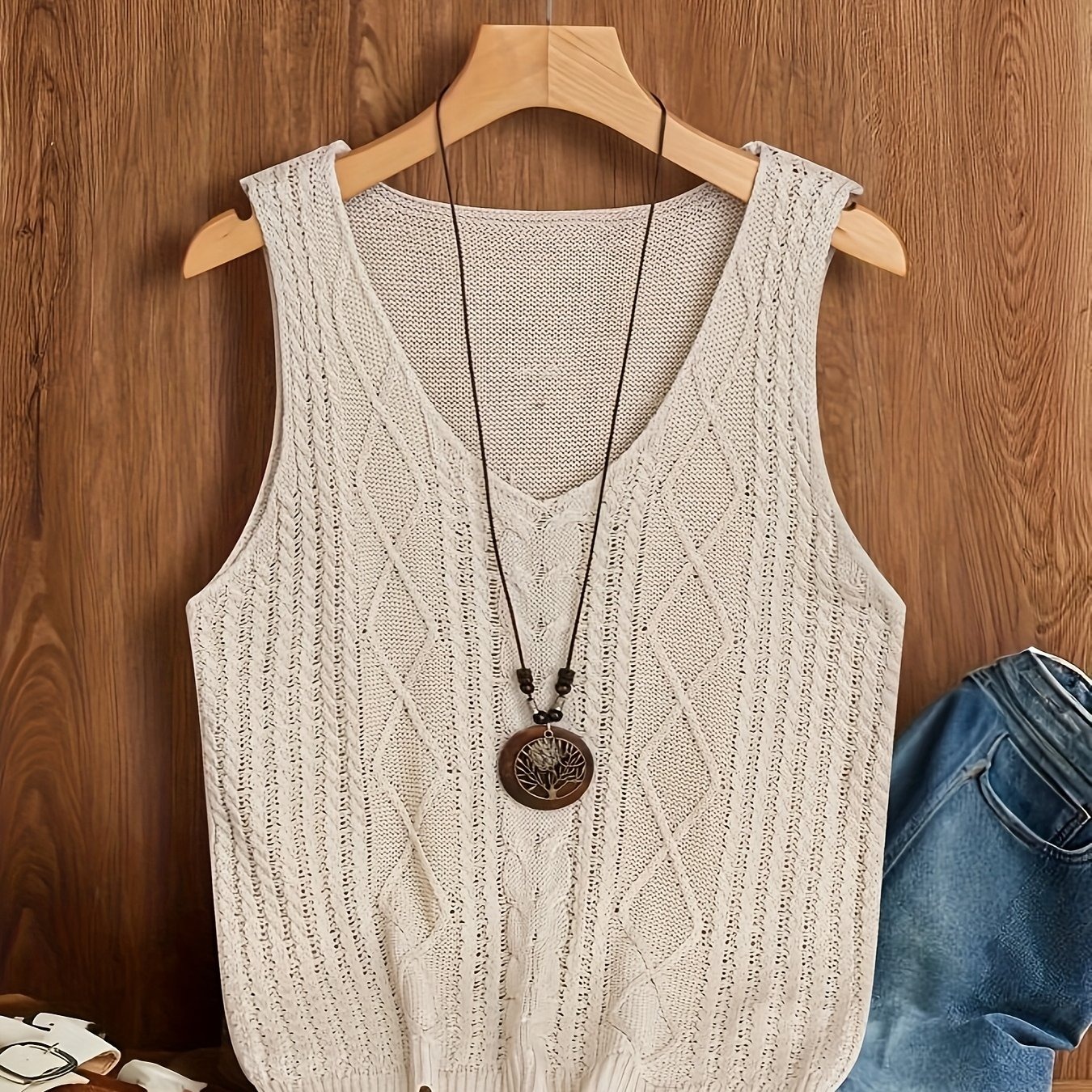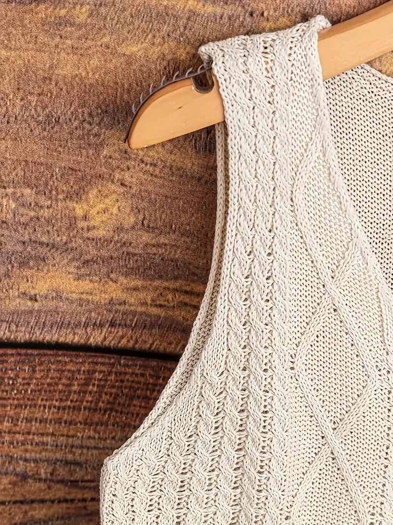 Blusa sin mangas confeccionada en punto con diseño de trenzas y rombos tejidos que aportan textura y elegancia. Su escote en “V” estiliza la silueta y el tono beige claro la convierte en una prenda neutra y fácil de combinar. Perfecta para un estilo relajado pero con toques sofisticados.