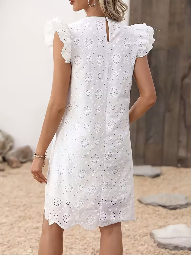 El vestido “Alba” es una oda a la feminidad natural. Con un delicado bordado floral sobre fondo blanco, manga corta con volantes y silueta recta, es perfecto para un look fresco y elegante. Ideal para días soleados, paseos en la playa o eventos casuales donde quieres destacar con sencillez y estilo.
