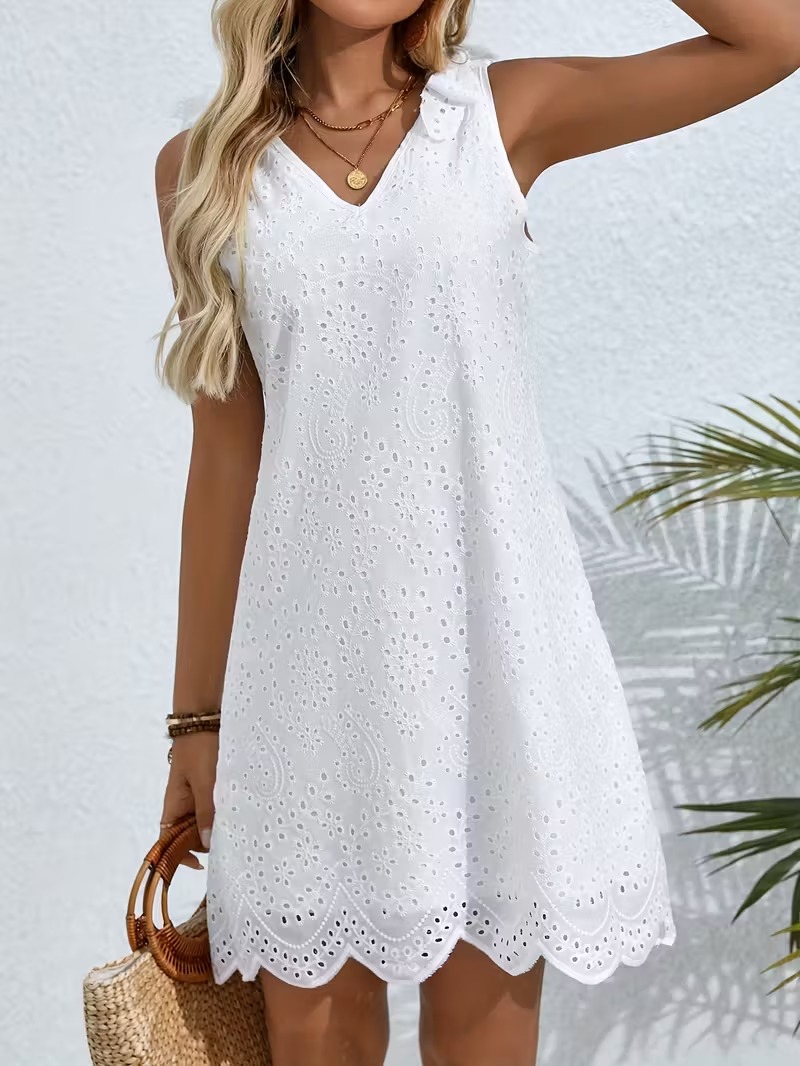 Este vestido tipo A es la fusión perfecta entre frescura y elegancia. Confeccionado en broderie blanco, presenta un diseño con escote en V y moños en los hombros que le dan un toque romántico y femenino. Su caída ligera y detalles perforados lo convierten en la opción ideal para días soleados, vacaciones o eventos casuales con estilo.