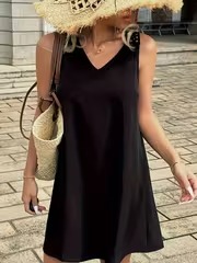Un vestido negro elegante y fresco con un distintivo detalle de encaje en la espalda que roba miradas. Su diseño sin mangas y caída fluida lo convierte en una prenda cómoda, versátil y con un toque bohemio chic.