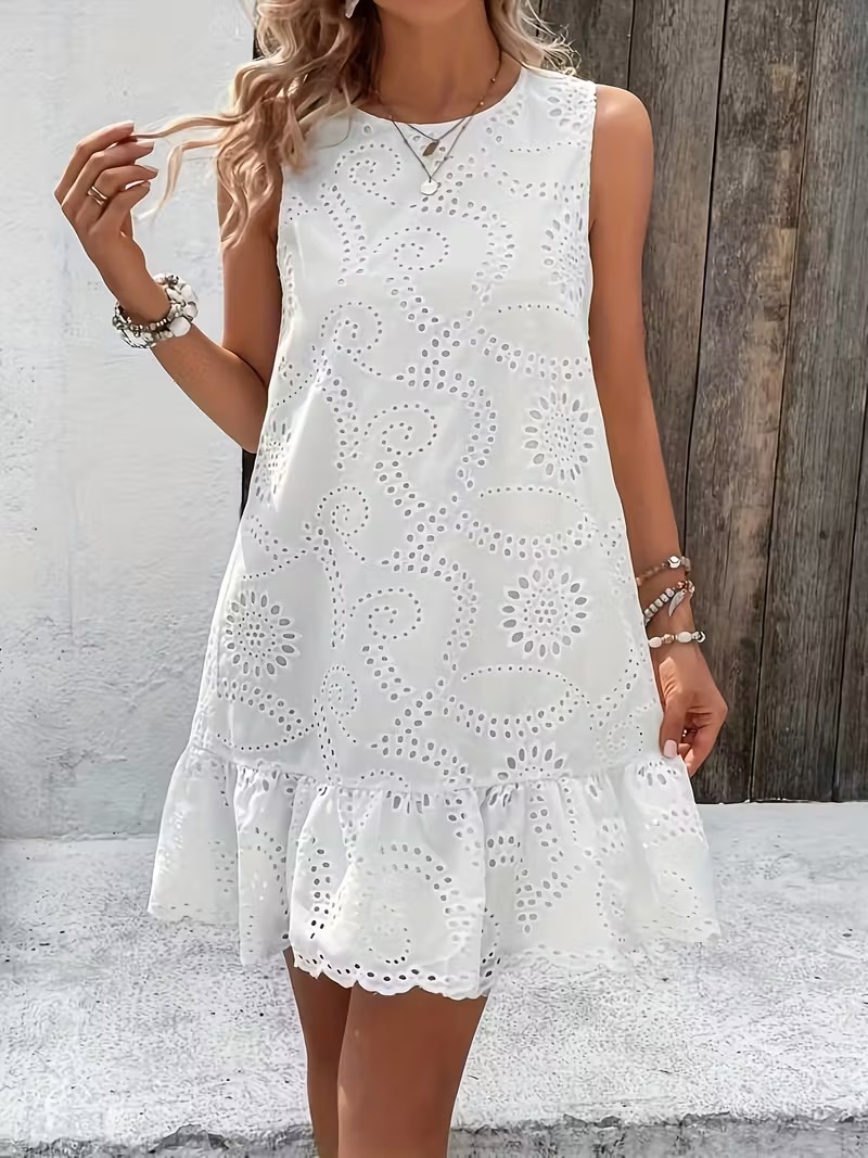 Este vestido blanco tipo broderie captura la esencia del verano con su frescura, suavidad y elegancia sutil. Su diseño sin mangas y el delicado olan en la parte baja brindan movimiento y feminidad. Ideal para disfrutar de los días soleados con un toque romántico y chic.