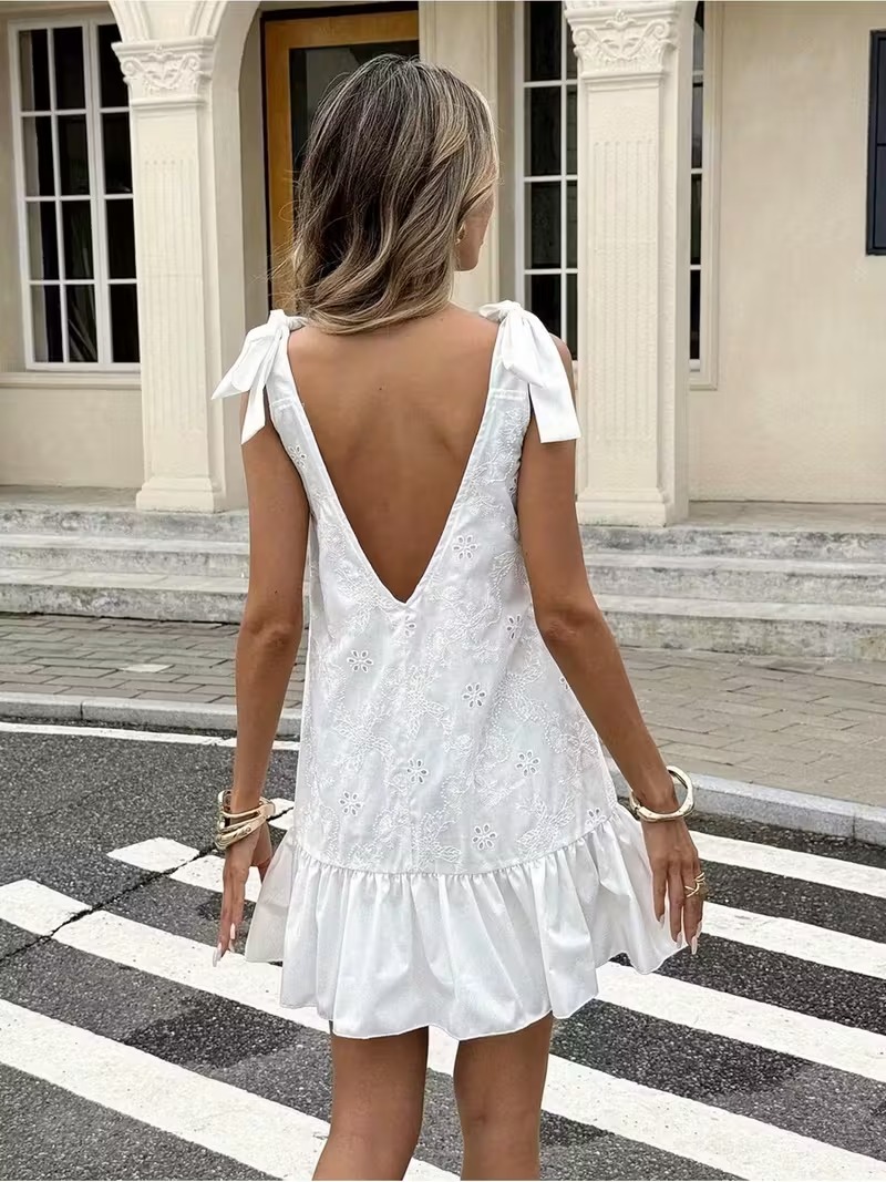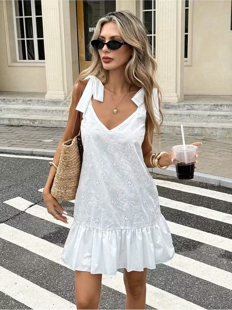 Un vestido blanco ligero, lleno de movimiento y delicadeza, ideal para reflejar el encanto de los días soleados. Su diseño con escote en «V», espalda baja y moños en los hombros, lo convierte en una prenda fresca, romántica y femenina. El bordado floral y el volante en el dobladillo añaden un toque boho chic que no pasa desapercibido.