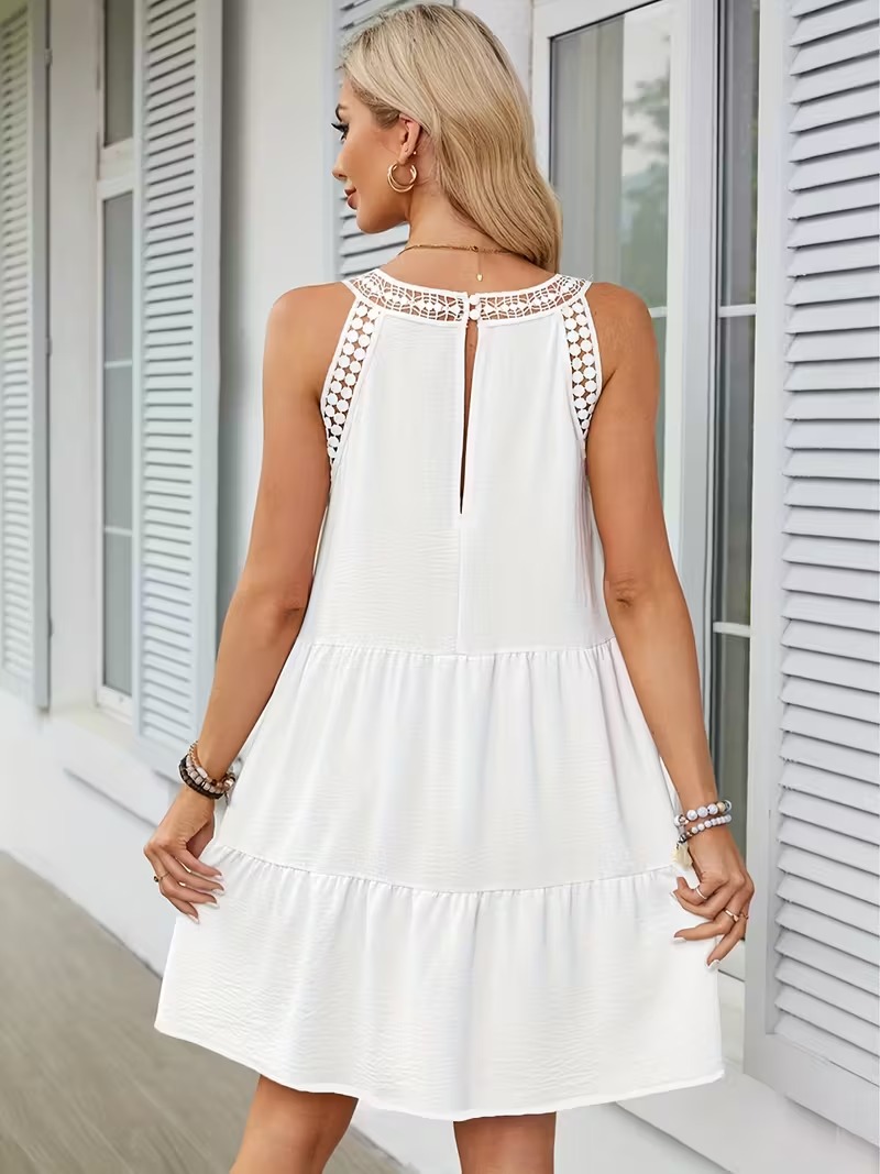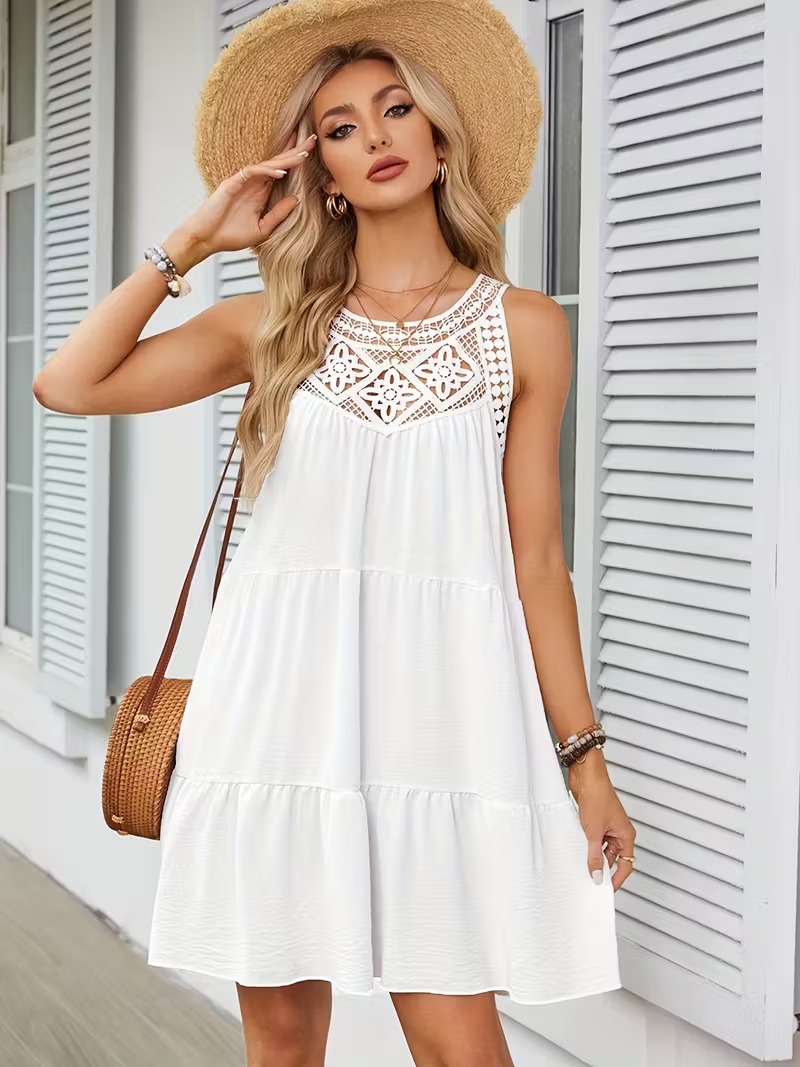Vestido corto blanco tipo A con detalle de encaje floral en el pecho y escote alto. Su corte amplio y tejido ligero lo convierten en la prenda ideal para un look fresco, femenino y chic en climas cálidos.